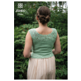 Dieses Oberteil ist von oben nach unten nahtlos gestrickt. Es hat ein Lochmuster in der Passe, einen glatt rechts gestrickten Rumpf und eine Spitzenbordüre am unteren Rand. Um die Taille zu formen, gibt es mehrere Möglichkeiten. Das Oberteil kann entweder mit dem gleichen Halsausschnitt vorne und hinten gestrickt werden, so dass es gewendet werden kann, oder man strickt es hinten etwas höher, so dass es vorne etwas tiefer ausgeschnitten ist.